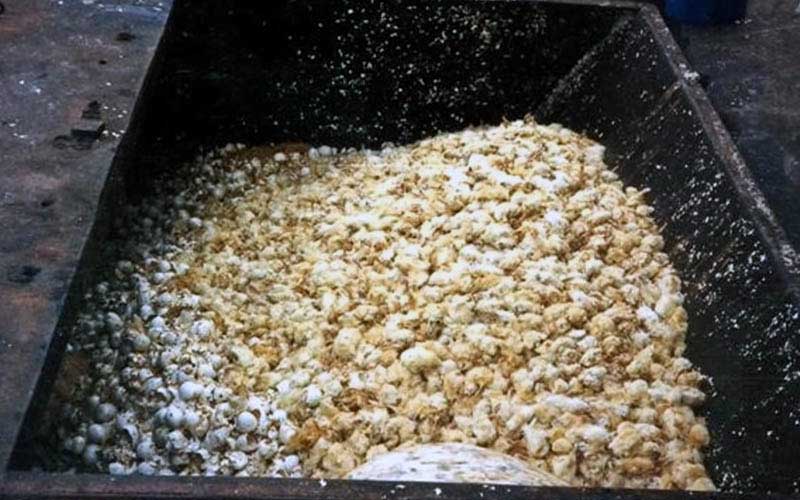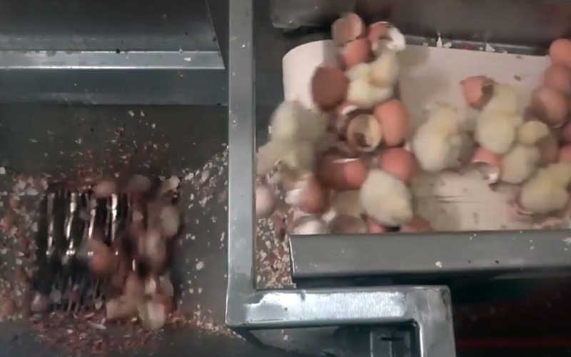In hatcheries, male and female chicks are sorted. Males are, like male calves in the dairy industry, considered "waste" and are killed either by being crushed, macerated, gassed, drowned or suffocated in a bag. Females have their beaks cut with heated blades and sent to the farm.