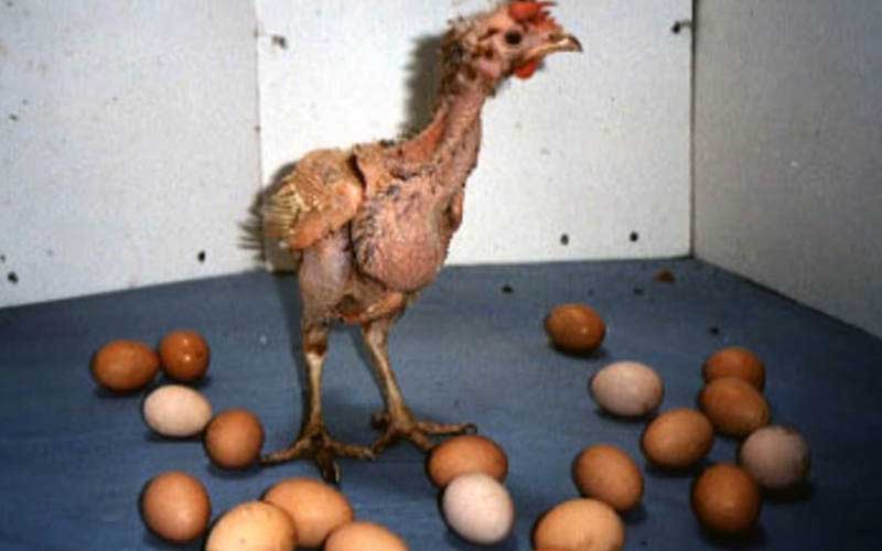 It is very common to starve hens, to shake their bodies into a rapid laying cycle, for as many as 5 days and up to 14 days, and this, three or four times. To maintain such an annual egg production, a hen will use an amount of calcium that is greater than its entire skeleton (30 times or more). This is why laying hens usually suffer from weak bones, fractures, debilitating osteoporosis, and even paralysis, because their bodies are constantly losing more calcium to produce the eggshell than they are. assimilate in their diet. A large number of chickens suffer from fatty liver disease or fatty liver syndrome caused by the constant overworking of liver cells to produce the fat and proteins necessary to make the egg yolk.