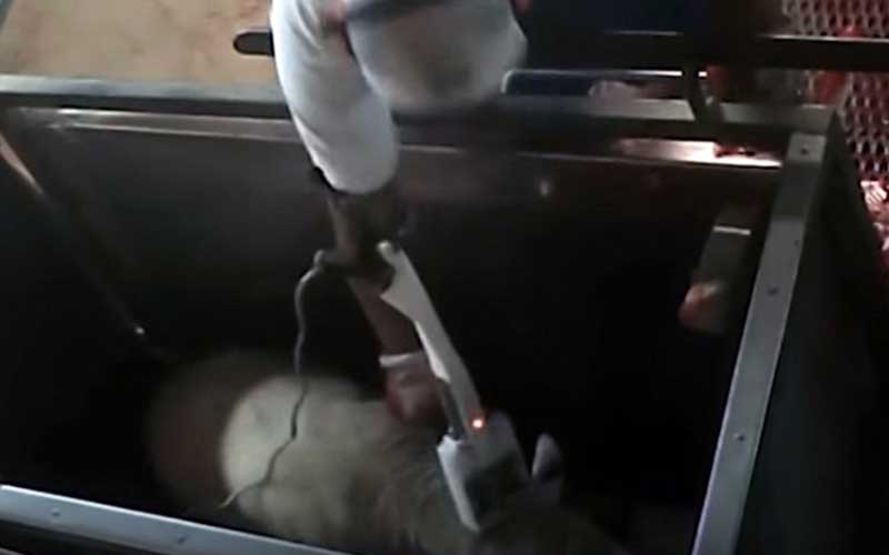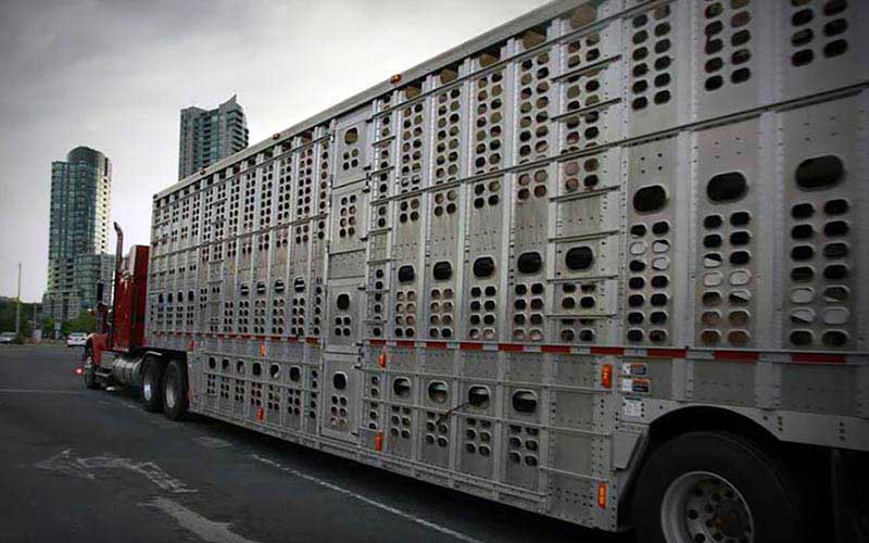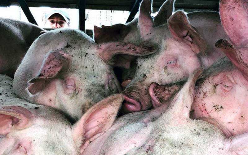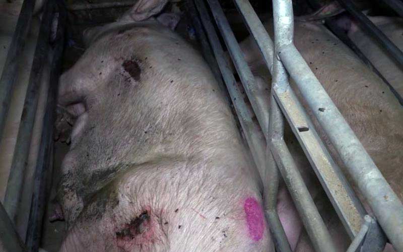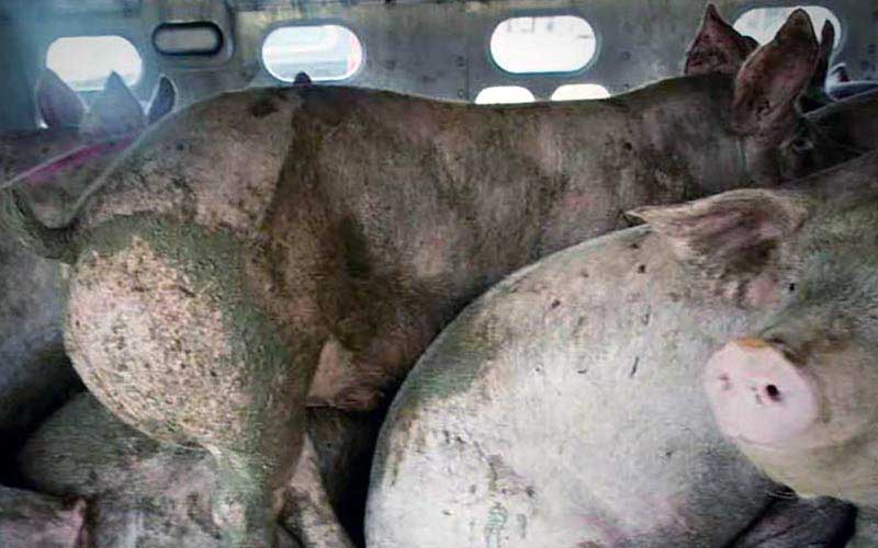 TRANSPORTATION When they are only a few months old, they are taken to the slaughterhouse where they are gassed to death in a CO2 well or hung upside down and slaughtered. Some are transported alive on ships on long voyages, often suffering from extreme temperatures. They are deprived of food, water and veterinary care, and many fall seriously ill or die during the journey. We have seen dead and dying (but still conscious) pigs being thrown overboard.
