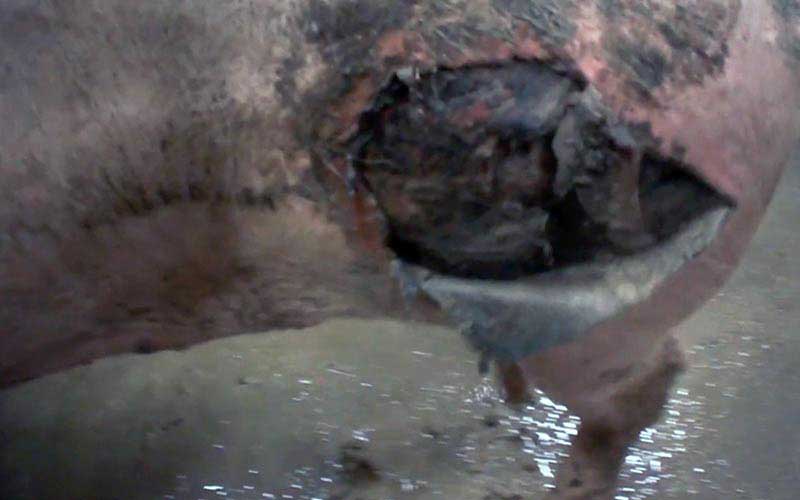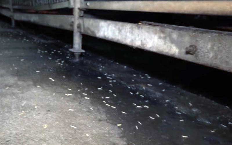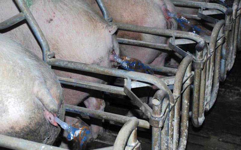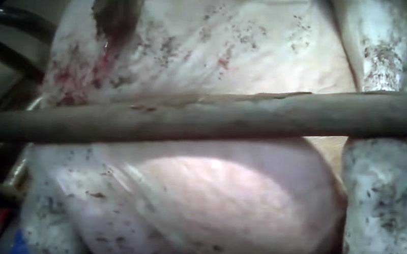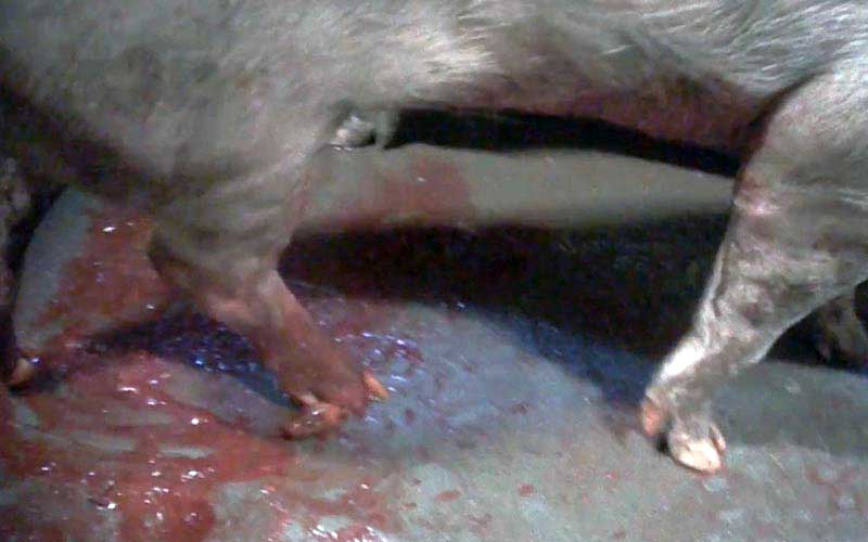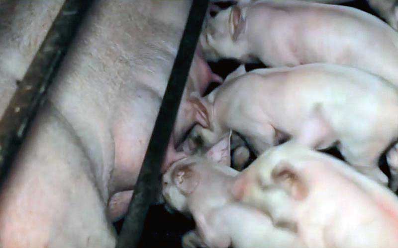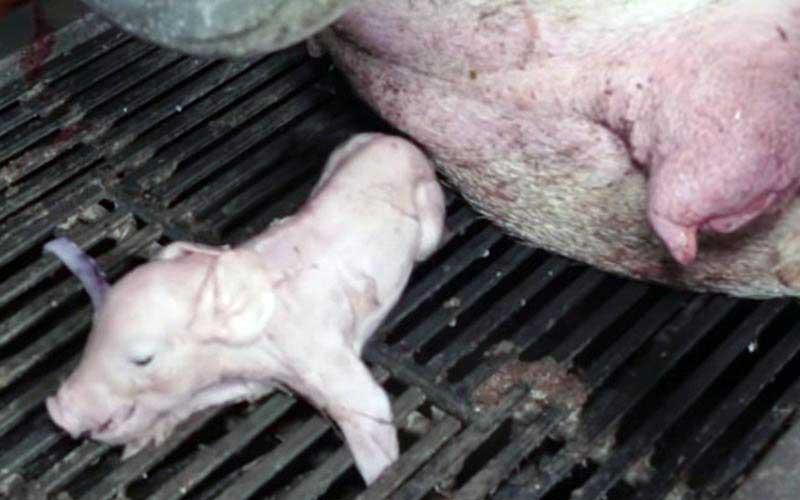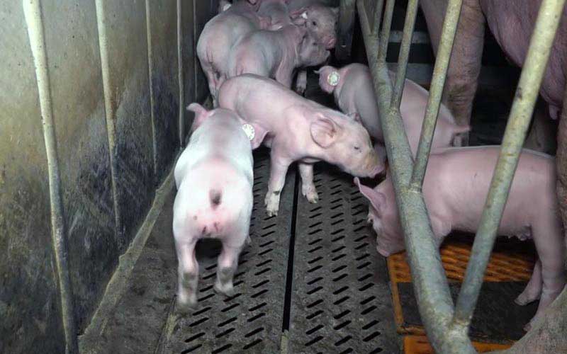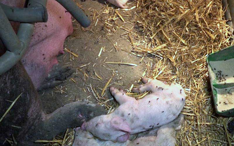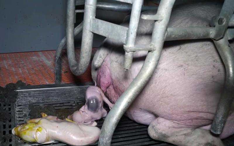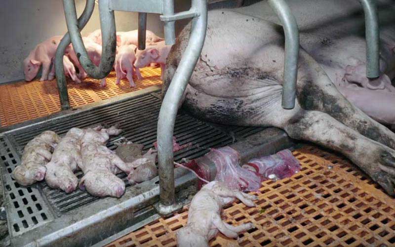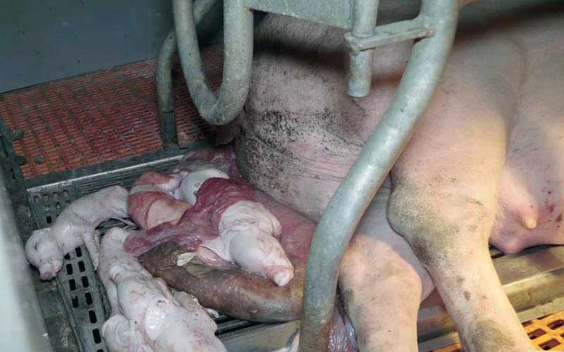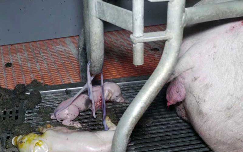 The paws of newborn piglets get stuck in the slits of the slatted floor (openwork floor). Many die at birth, sometimes crushed by their mothers.