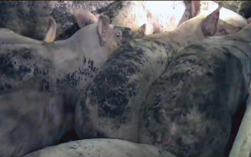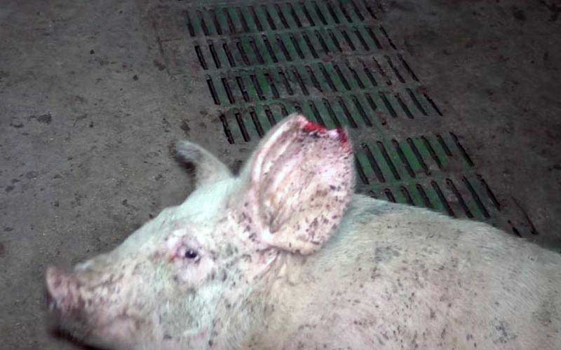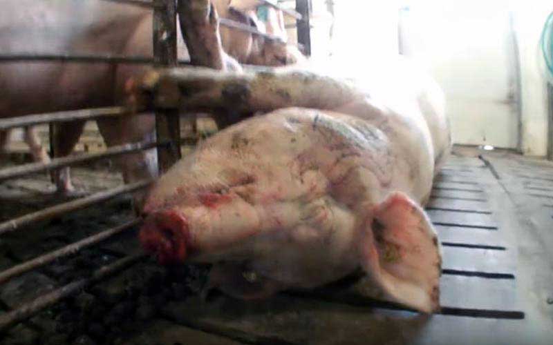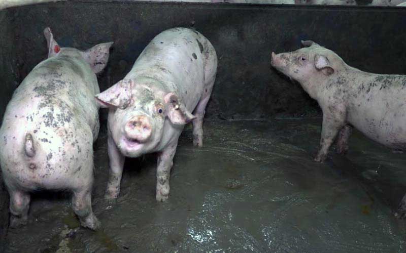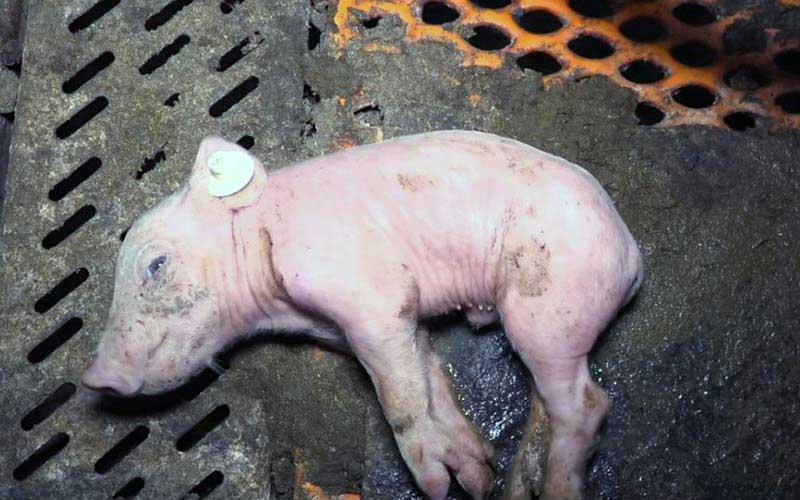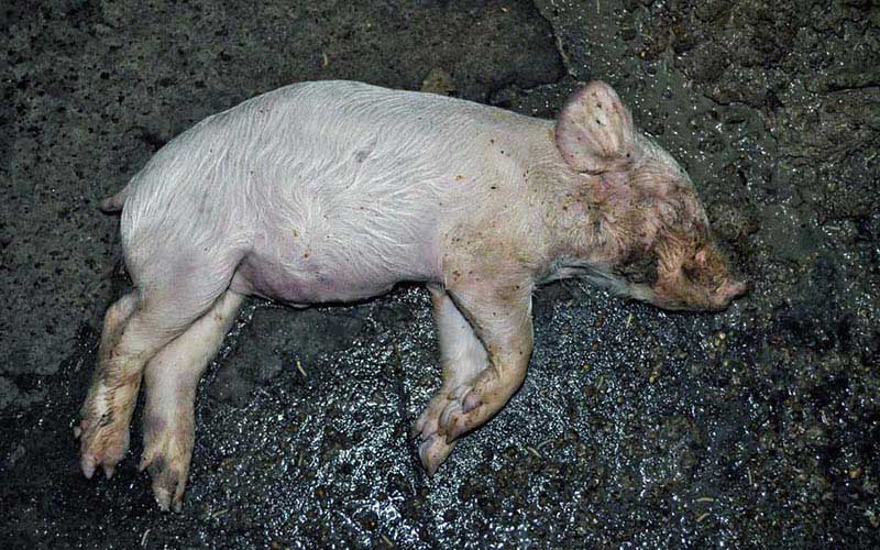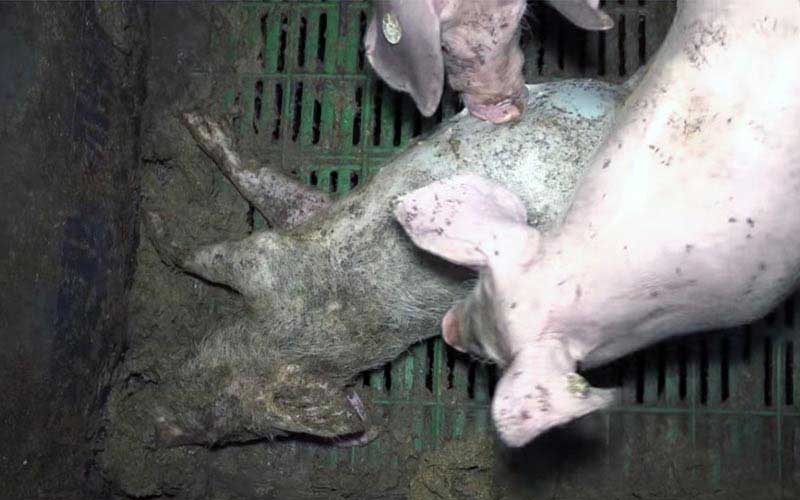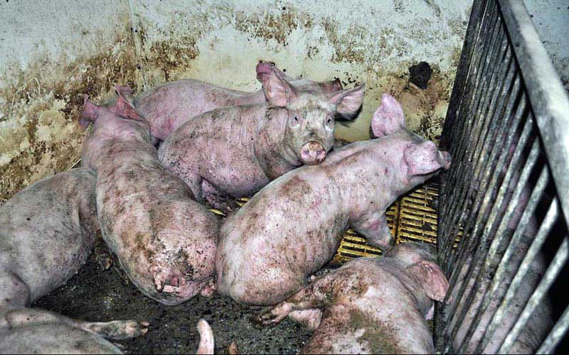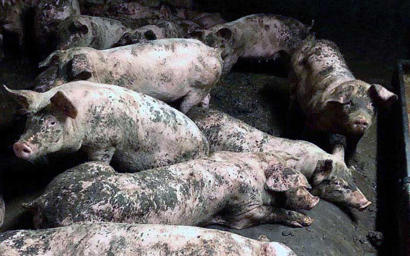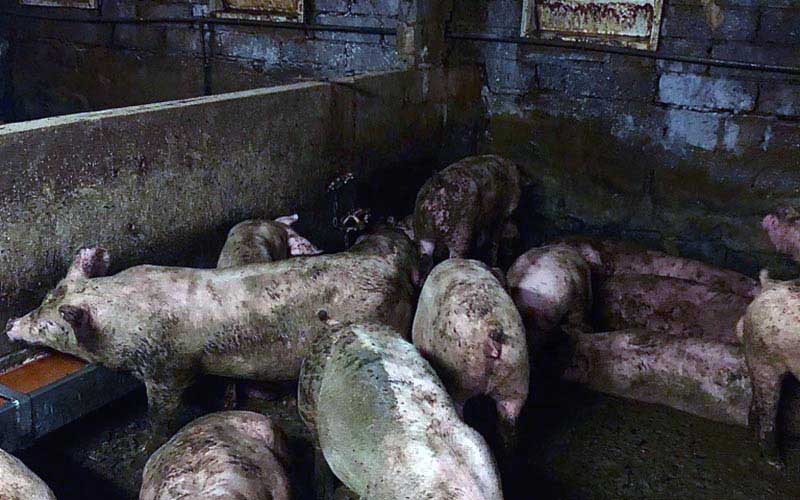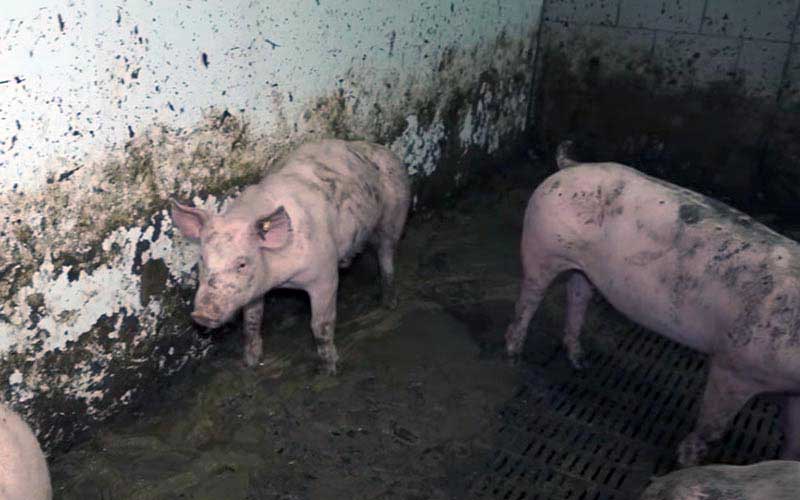 JAIL However, they are deprived of everything that is natural to them. They may never see the sun or breathe fresh air. In almost all cases, the pigs live penned and crammed in dull concrete enclosures or in overcrowded sheds in a deplorable state of hygiene: filthy enclosures, accumulation of droppings, profusion of flies, stagnant water. The corpses of pigs of all ages, adults or piglets litter the ground. Some are in an advanced state of decay, left among living animals.