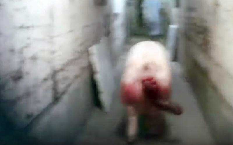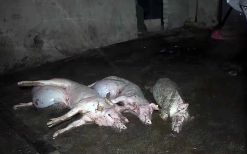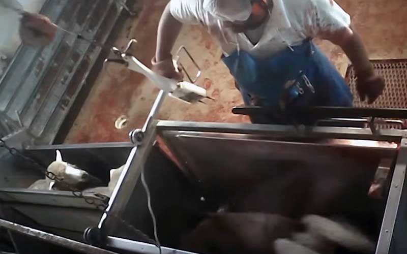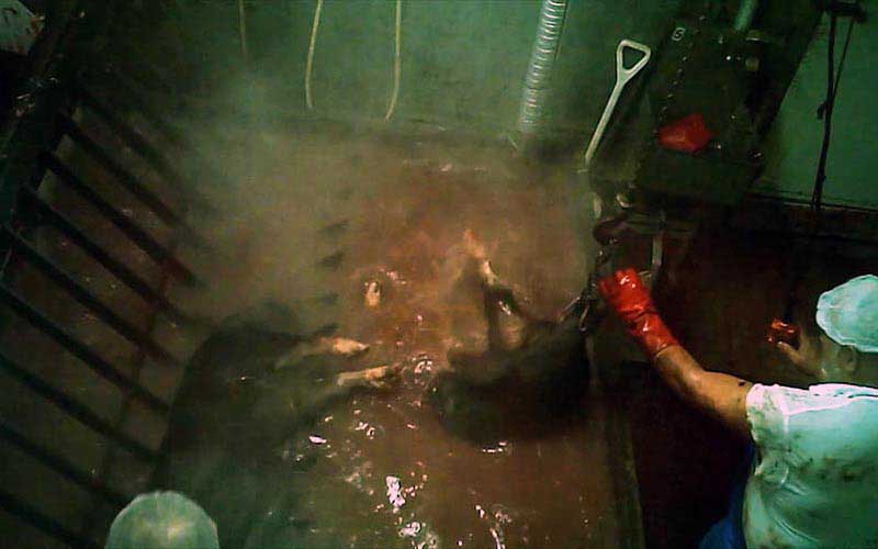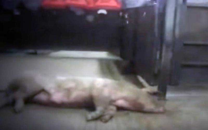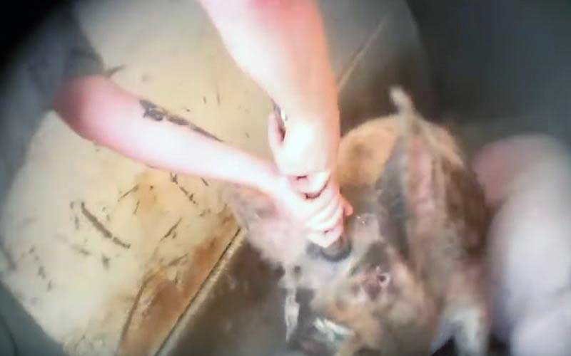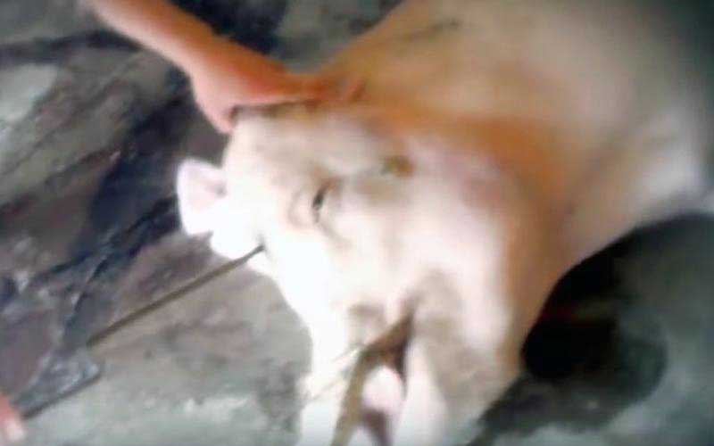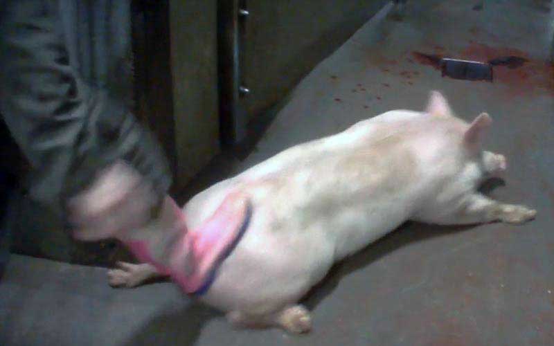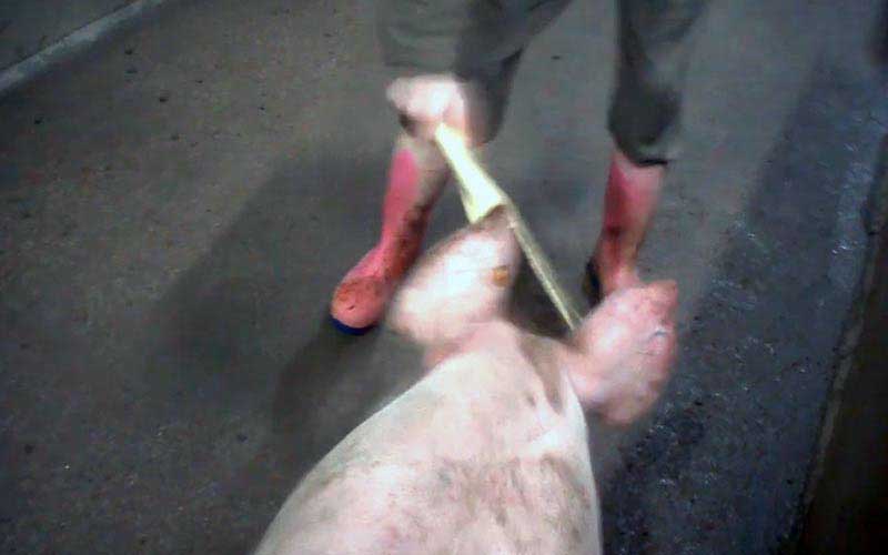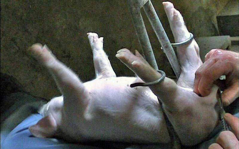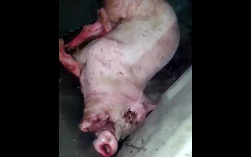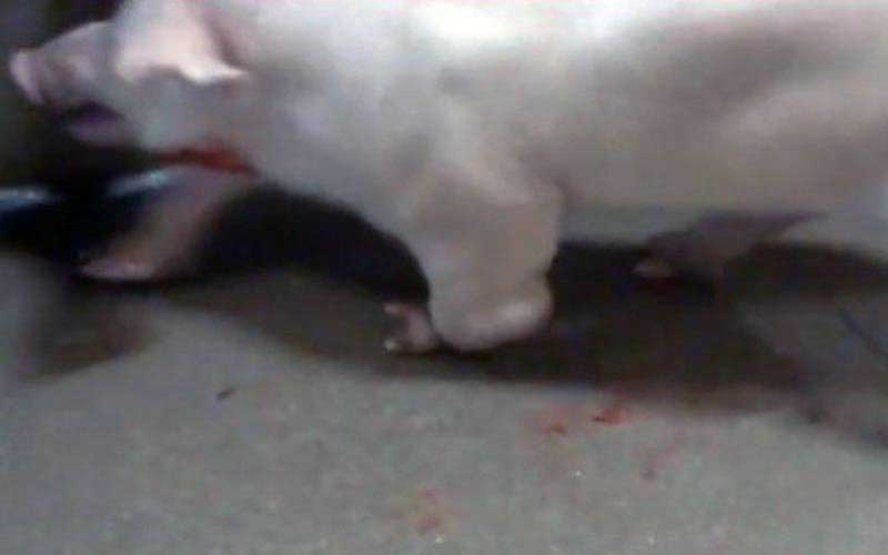 SLAUGHTERHOUSE At the slaughterhouse, the pigs are hung by the hind legs before being killed. The employees are in such haste that they stun them badly, and so they come to themselves and are conscious as they are bled to death and plunged into boiling water.