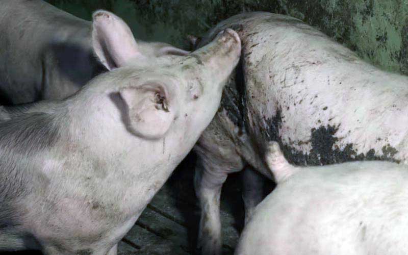 MENTAL HEALTH and ITS CONSEQUENCES The frustration and stress caused by this extreme confinement can lead to aggressive behavior, such as: fighting, tail-biting (biting the tails of congeners), biting the ears of congeners, or even stereotypies (pathological repetitive movements). Pigs with open wounds are eaten by their fellows. Male pigs experience chronic pain from placing a ring in their snout.