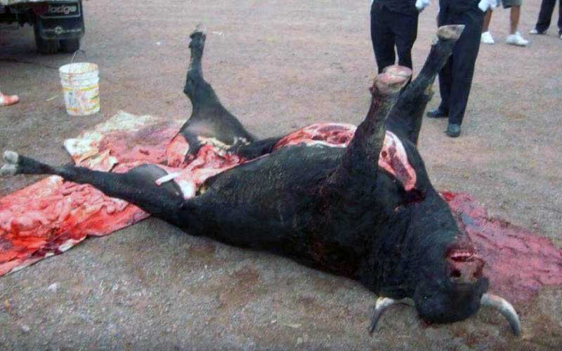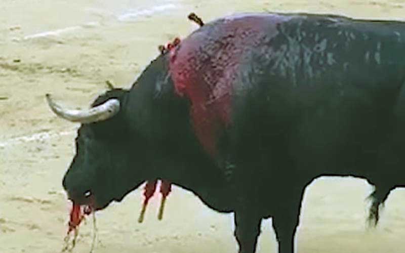 BEFORE THE "COMBAT" : Before the fight, parts of the animal's body may be weakened. The horns are frequently sawn up to ten centimeters of horn and then push the nerve back to the root, which is very painful and, in addition, causes the bulls to lose their spatial references. Massive doses of sedatives or anti-inflammatory drugs are also used in order to make the bull better resist the pain he will have to undergo. The bulls, who have a precise mental image of the length of their horns before mutilation, will therefore miss touching their torturers when they try to re-horn them, which reduces the risk of the bullfighters being injured. In addition, since the bull's horns are very sore, he will hesitate to use it to repel his attackers. During restraint in the winch box, the hooves can also be filed or even incised. Wooden wedges will then be inserted between the hooves. This operation will greatly destabilize the animal, which will find it difficult to remain quiet.