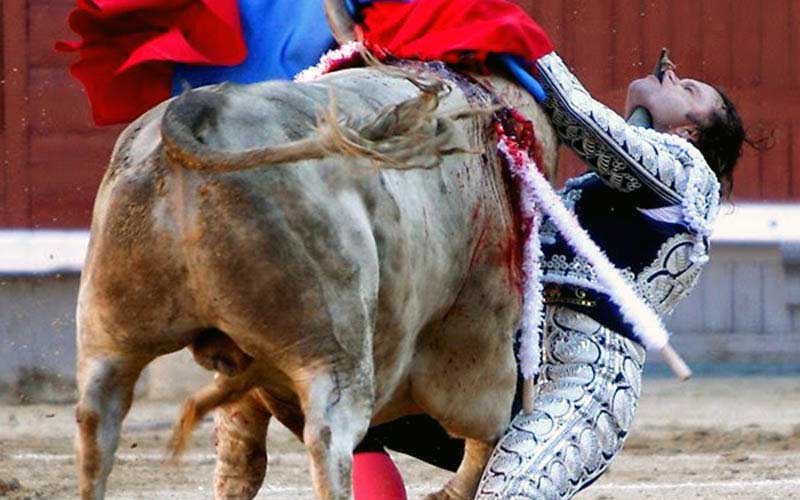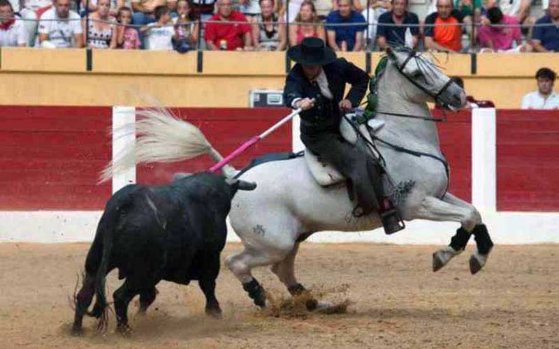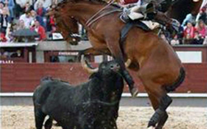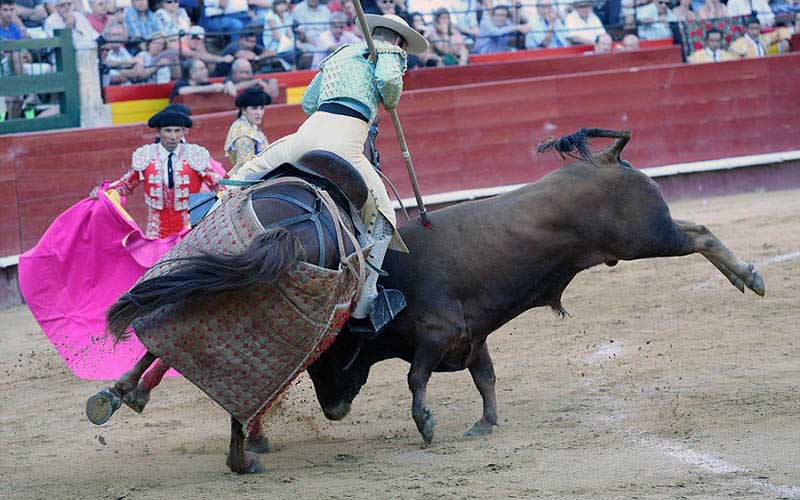 FIRST ACT (THE TERCIO DE PIQUE): In the first act, two picadors, plants of the pikes (the puyas) on the bull. Between the fourth and the seventh dorsal vertebra, the puyas, cut the levator and extensor muscles of the neck and between the fourth and sixth cervical vertebrae, they cut the ligaments of the neck. With each push of the bull, the spike sinks a little more, up to 20 cm thanks to a screwing movement. This is called "working the bull". Six to eight times in succession, the pike digs into the back of the animal. For the bullfighter, the benefits of a "job well done" are enormous. Indeed, the bull can no longer move its head and the guard down during the various passes and demonstrations. All danger, or almost, is eliminated. A false "bravery" effect is given by the impression that the bull will charge at any time.